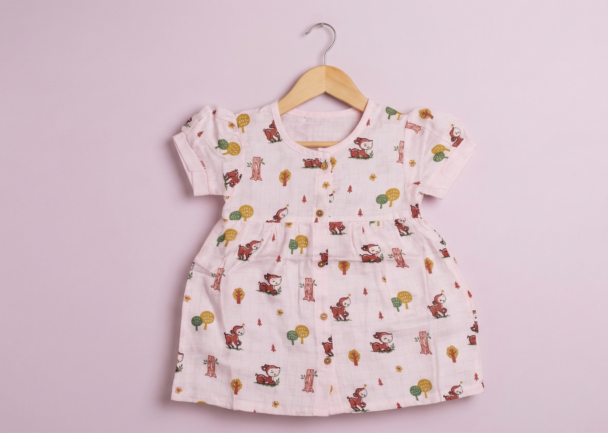 Description: The Blush Fawn Puff-Sleeve Dress is a soft and breathable everyday essential made from 100% organic cotton muslin. Featuring a delicate woodland print with fawns and trees, it comes with charming puff sleeves, a gathered waist, and a front-button closure for easy and comfortable wear.