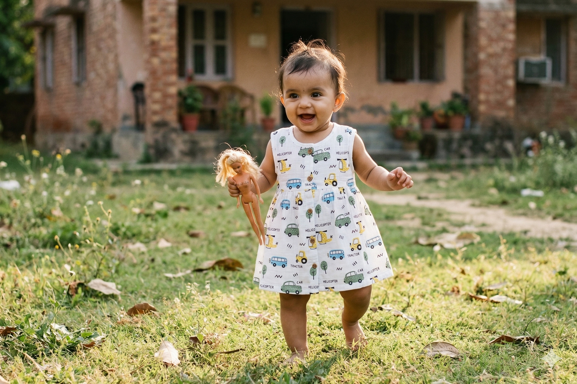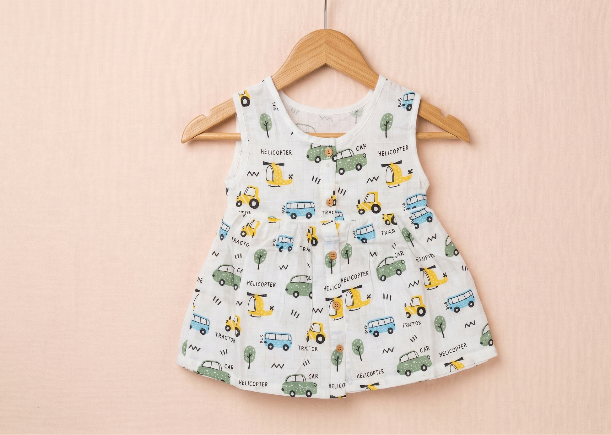 Description: The Busy City Sleeveless Dress is a soft and breathable everyday essential made from 100% organic cotton muslin. Featuring a fun transport-themed print with cars, buses, and helicopters, it comes with a sleeveless design, gathered waist, and front-button closure for easy and comfortable wear.