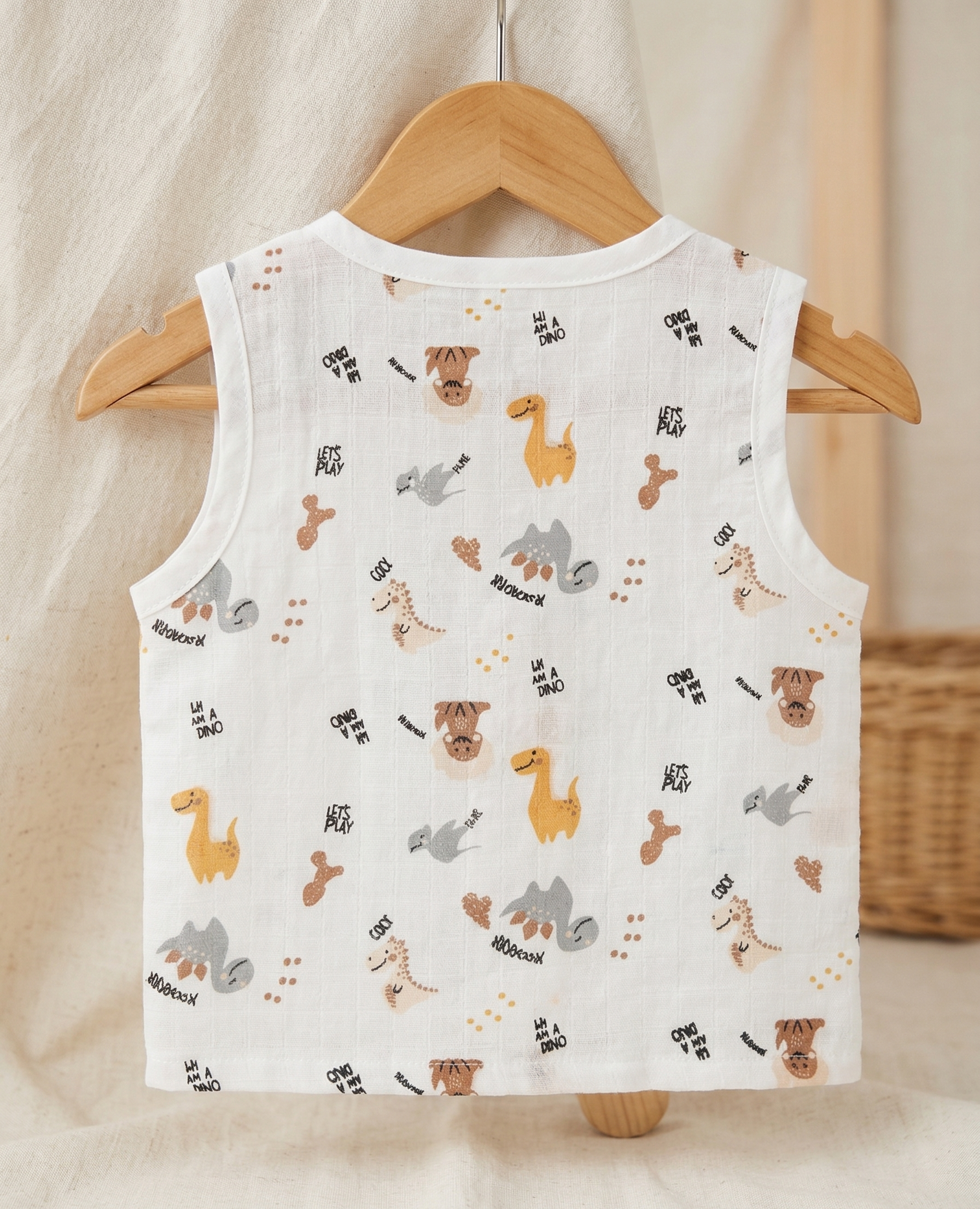 Description: The Dino Days Muslin Jabla is a lightweight, sleeveless button-down top made from soft 100% cotton muslin. This Jabla features an adventurous all-over print of friendly dinosaurs and "Let’s Play" typography in earthy tones. Its breathable, crinkled fabric makes it an ideal choice for layering or keeping your little one comfortable and stylish during active playtime.