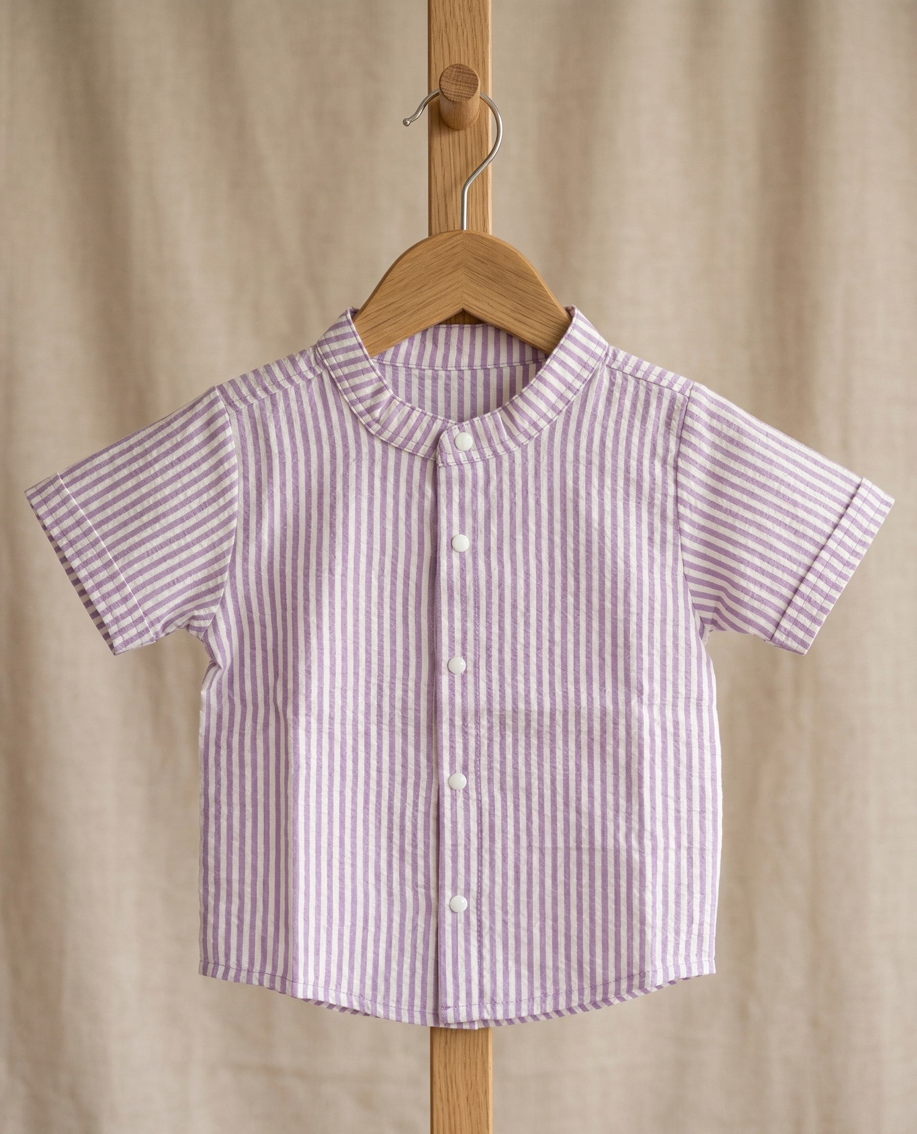 Description: The Lilac Stripe Seersucker Set is a sophisticated yet cozy two-piece ensemble crafted from premium pure cotton seersucker. Featuring a timeless vertical stripe pattern in a soft Lilac hue, this set includes a smart short-sleeve button-down shirt with a mandarin collar and matching relaxed-fit shorts. The unique puckered texture of the seersucker fabric provides natural airflow, keeping your little one exceptionally cool and stylish for special occasions or everyday elegance.
