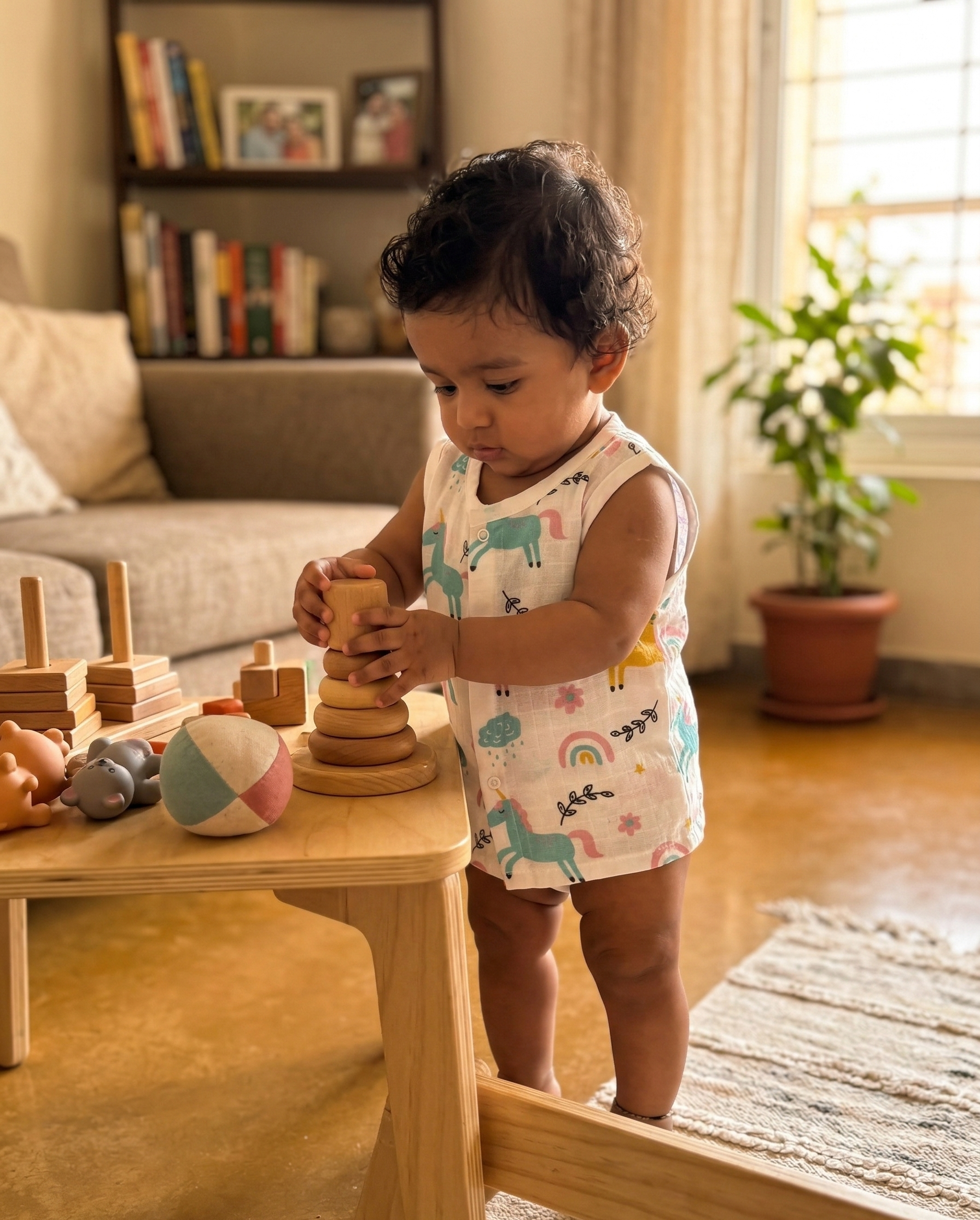 Description: The Magical Unicorn Muslin Jabla is an enchanting sleeveless top crafted from 100% breathable cotton muslin. Featuring a whimsical print of colorful unicorns, rainbows, and soft rain clouds, this Jabla includes a convenient snap-button front for easy dressing. The lightweight, crinkled texture ensures your little one stays cool and comfortable while looking absolutely magical.