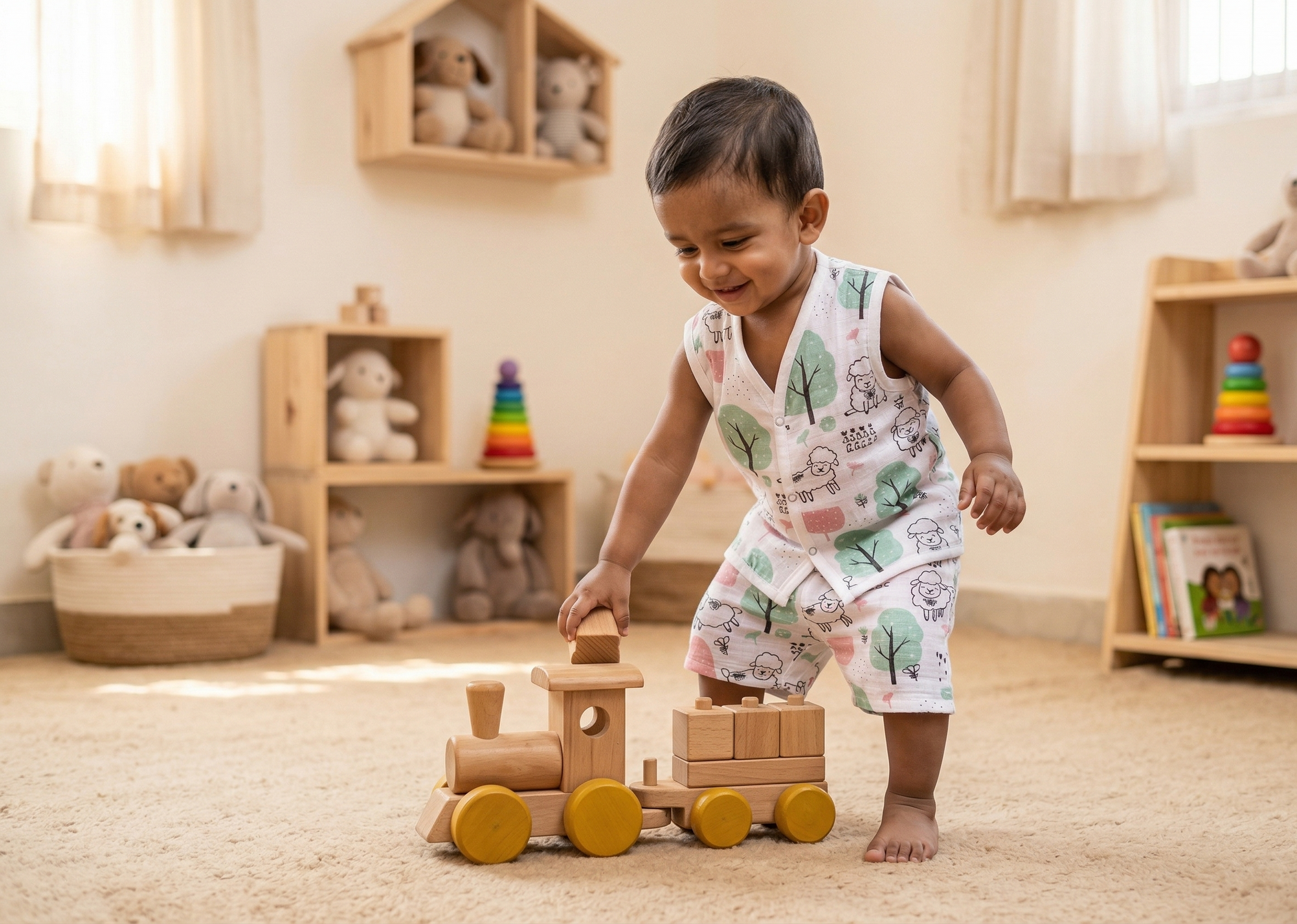 Description: The Meadow Lamb Sun Suit Set is a soft and breathable outfit made from 100% organic cotton muslin. Featuring a gentle lamb and pastel tree print, it includes a sleeveless vest with snap closure and matching elasticated shorts for easy and comfortable wear.