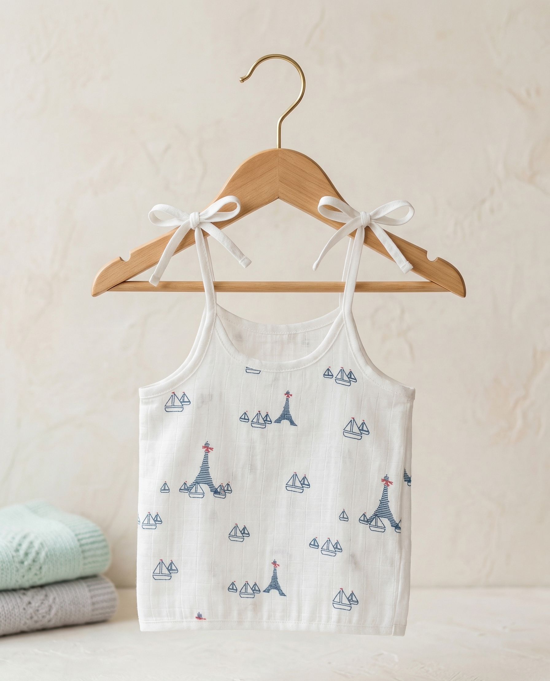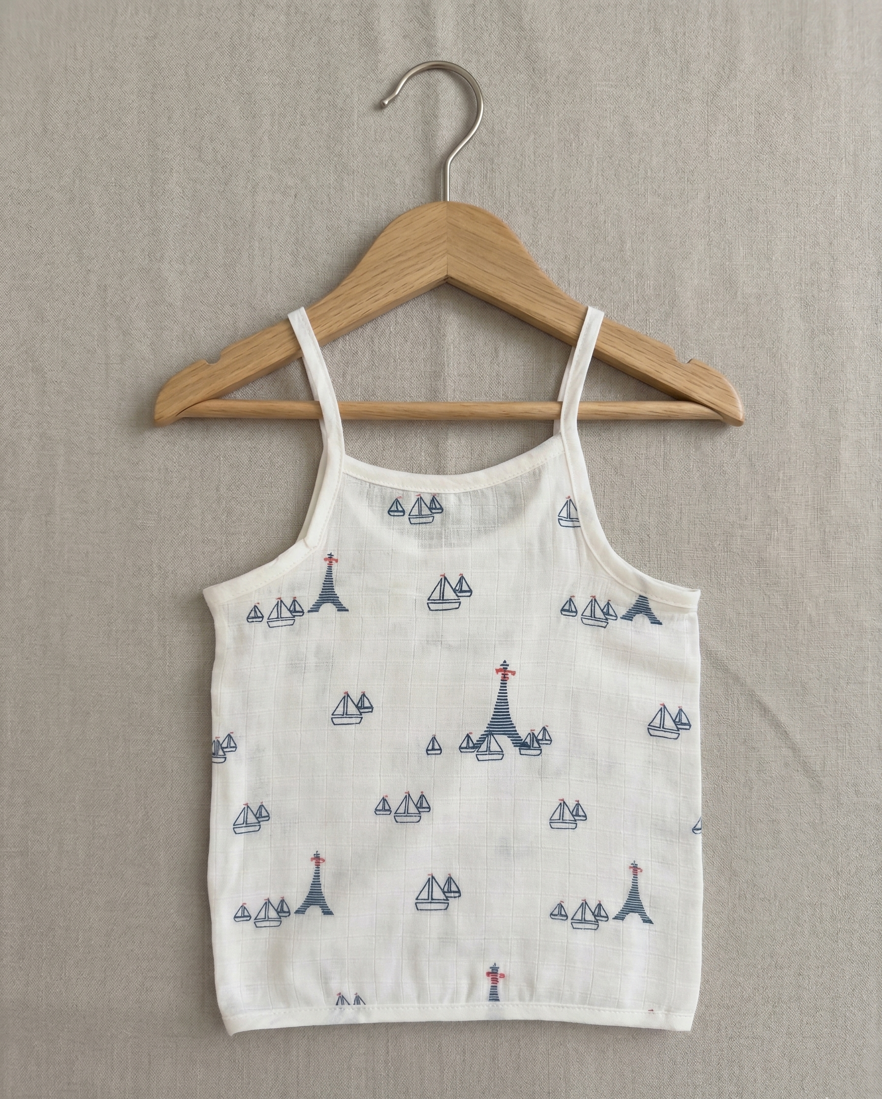 Description: The Nautical Adventure Muslin Camisole is a breezy and classic summer top made from 100% soft cotton muslin. Featuring an adorable sea-themed print of sailboats and lighthouses in navy and red accents, this lightweight camisole is designed with thin straps for a cool and comfortable fit. The signature crinkle-texture fabric ensures maximum breathability, making it the perfect choice for seaside strolls or warm sunny days.