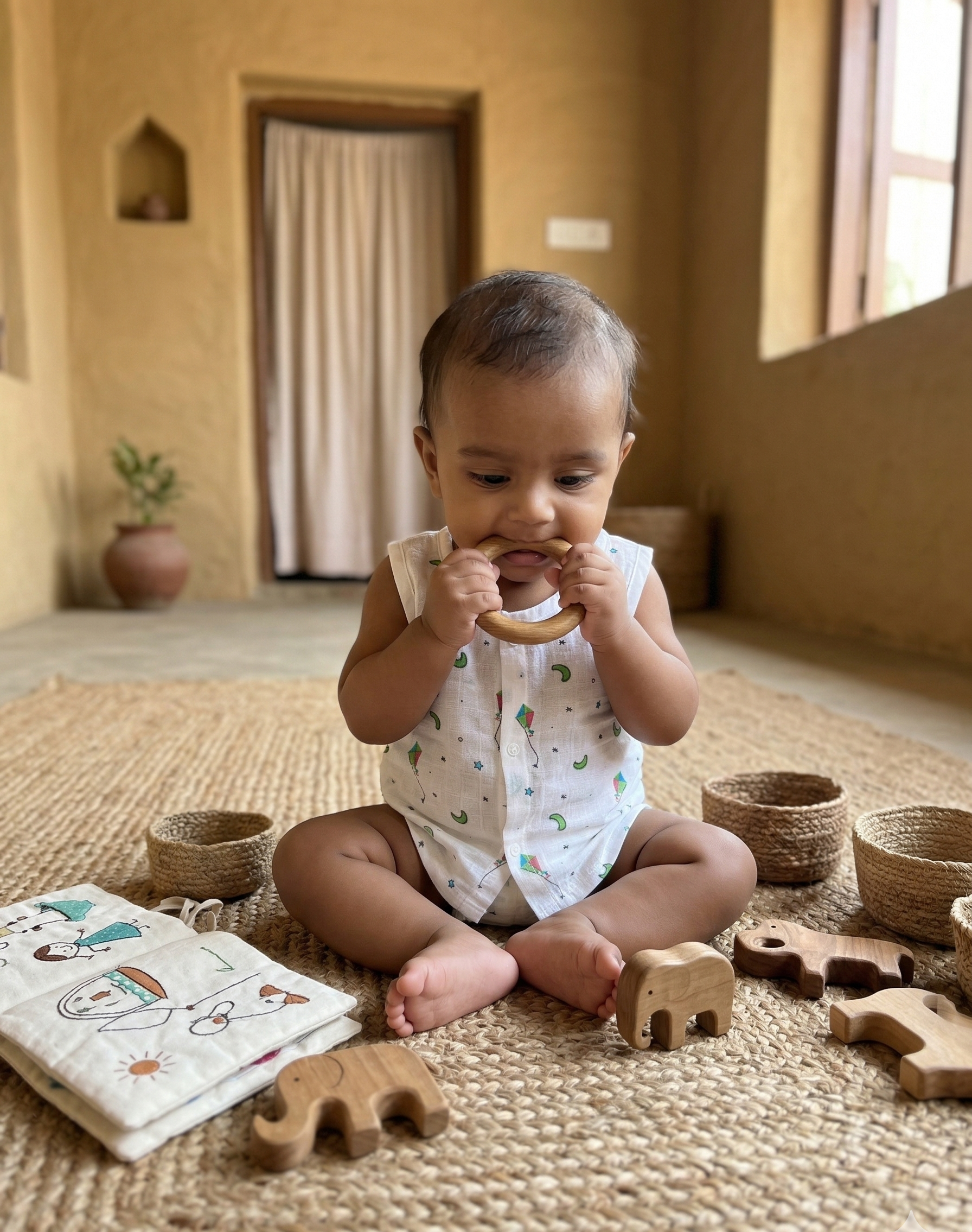 Description: The Sky High Muslin Jabla is a breezy, sleeveless top made from premium 100% cotton muslin. Adorned with a playful print of colorful kites, crescent moons, and twinkling stars, this Jabla features a practical snap-button front for quick changes. Its lightweight and breathable crinkle fabric is perfect for keeping your little one cool and relaxed during sunny daytime play.