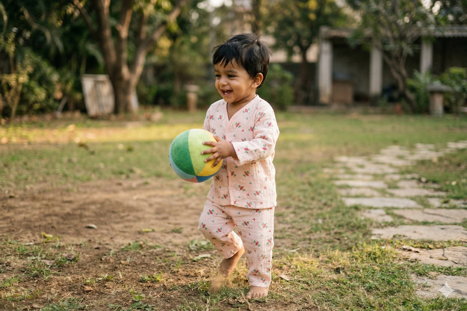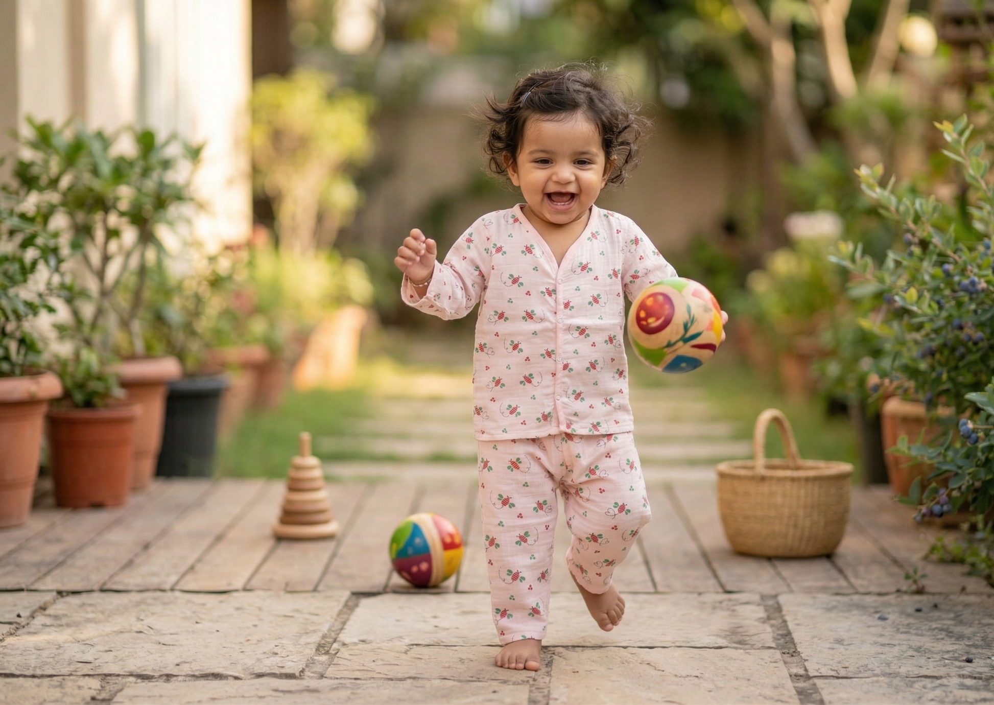 Description: The Busy Bee Cord Set is a soft and breathable two-piece outfit made from 100% premium cotton muslin. Featuring a charming bee and clover print on a peachy-pink base, it includes a snap-front top and an elasticated waistband for easy and comfortable wear.